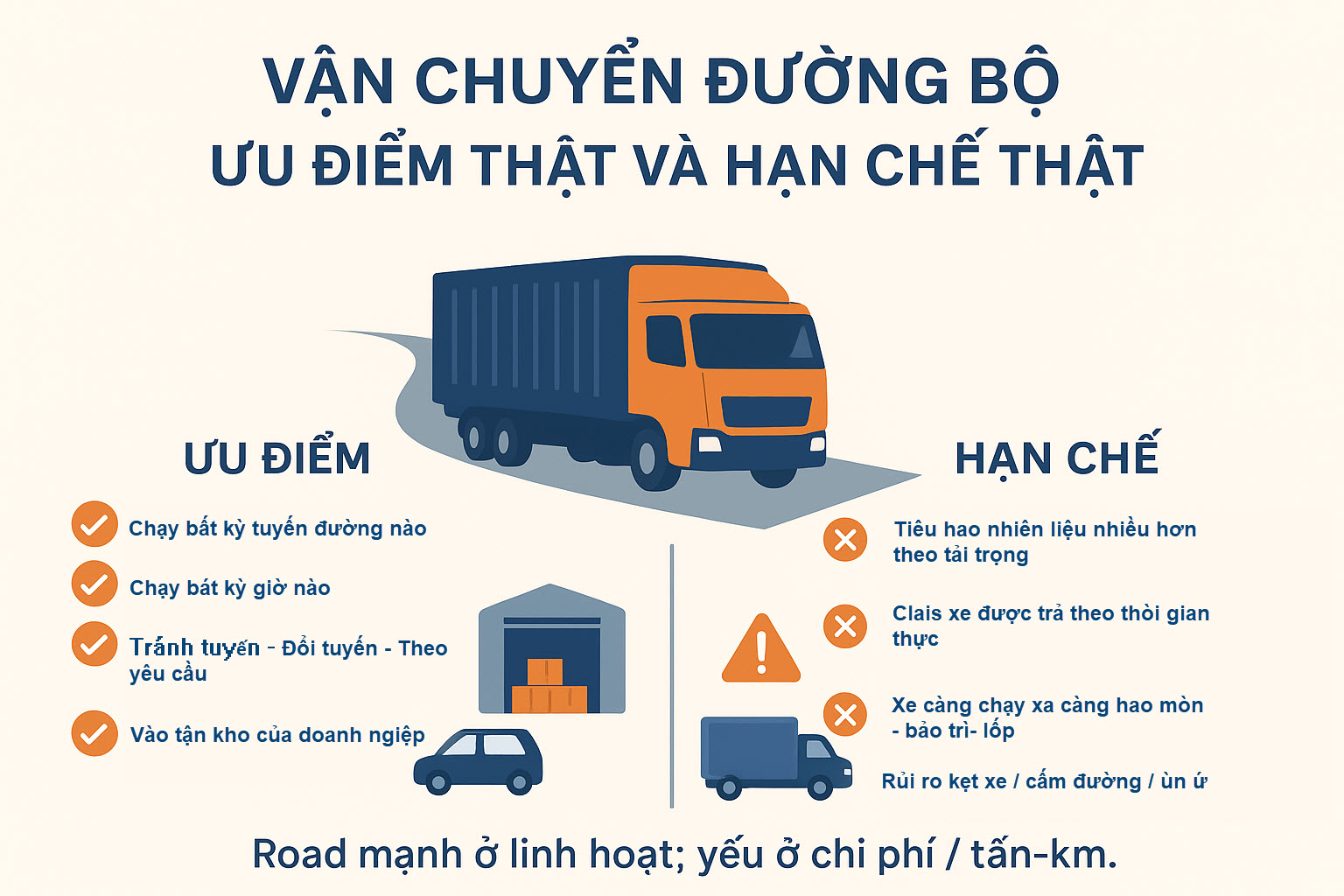 1) Vận chuyển đường bộ – ưu điểm thật và hạn chế thật (đã “thực chiến”)