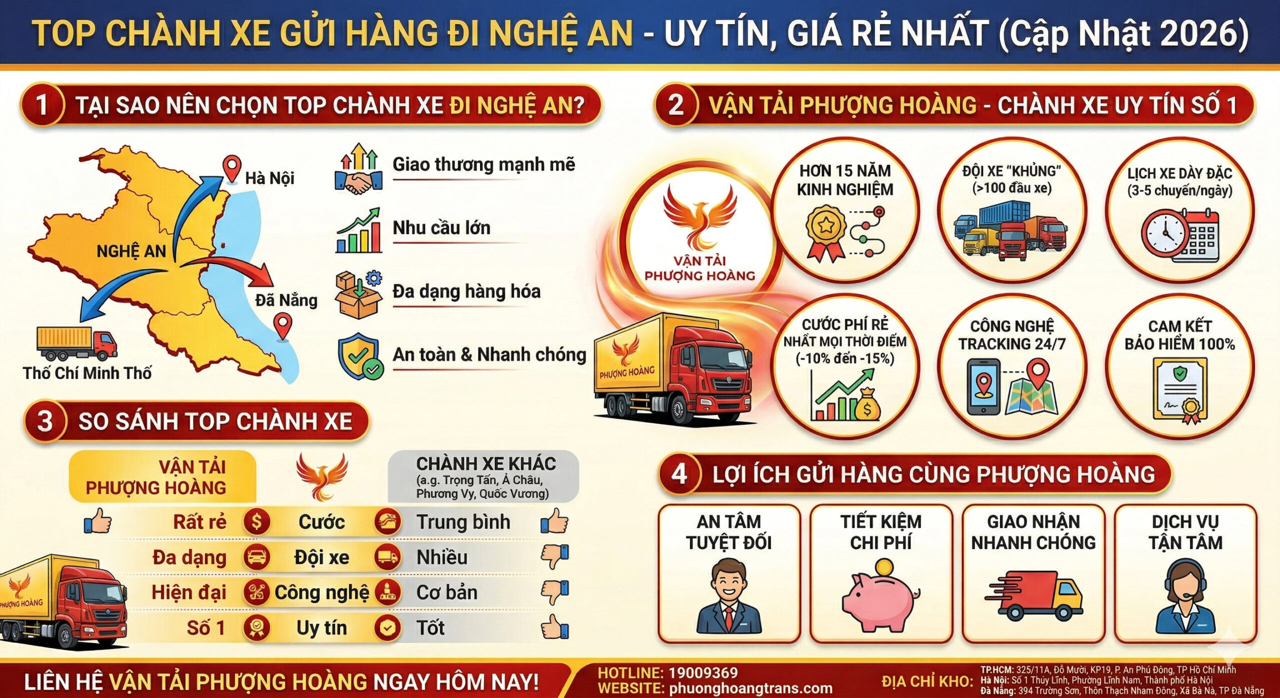 Bài viết dưới đây sẽ cung cấp cho bạn danh sách top chành xe gửi hàng đi Nghệ An uy tín, chuyên nghiệp và tối ưu chi phí nhất hiện nay. Đặc biệt, chúng tôi sẽ đi sâu phân tích lý do vì sao Vận tải Phượng Hoàng lại được đánh giá là chành xe uy tín số 1 trong tuyến đường này.